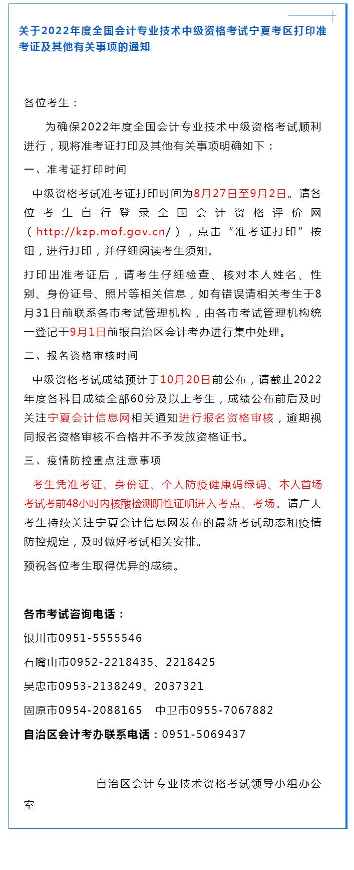 關于2022年度全國會計專業(yè)技術中級資格考試寧夏考區(qū)打印準考證及其他有關事項的通知